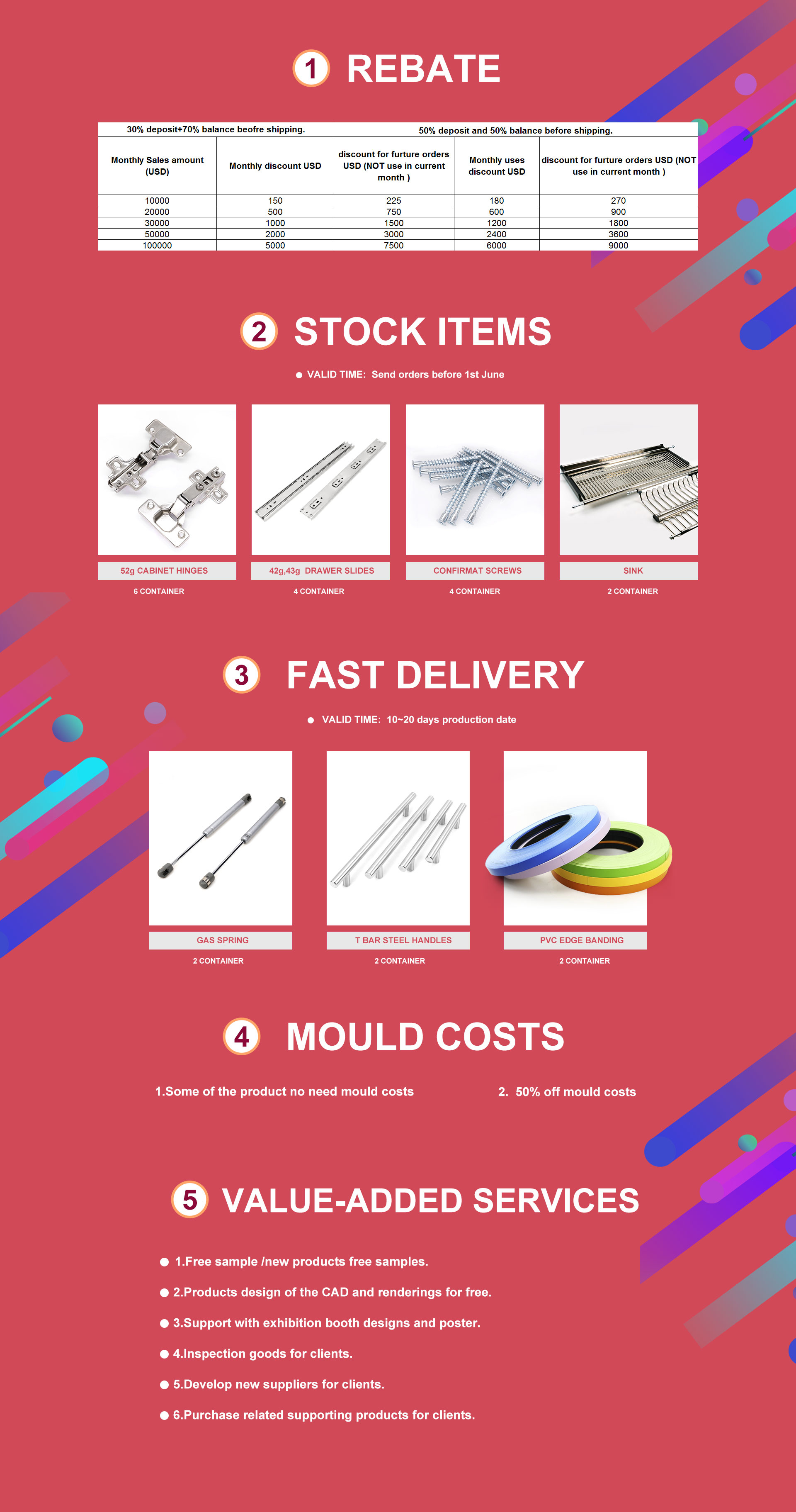 Prodotti principali: Cerniera per mobili, scivolo per cassetto, maniglia dell'armadio, gambe del divano, rotella per mobili